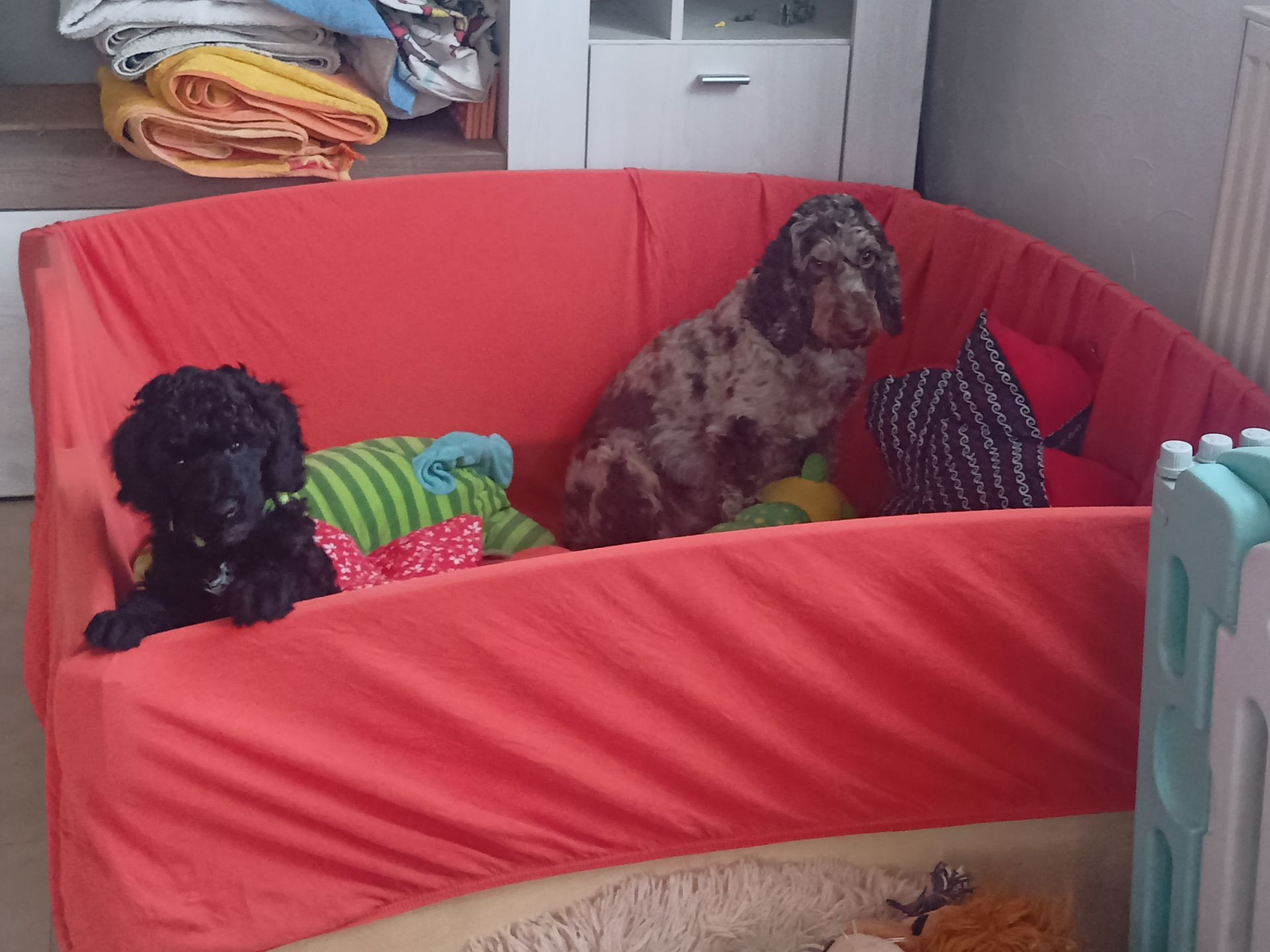 Erste Kontakte mit der Wurfbox hat sie schon genommen. Auch stört es sie nicht, wenn das Welpenkind einen Besuch bei ihr macht. Allerdings darf Fio nicht mehr ganz so nah an sie ran wie seither. Jetzt kommen langsam eigene Muttergefühle hoch - und sie möchte doch mehr und mehr ihre Ruhe haben. Was von Fio ohne weiteres akzeptiert wird. Dann spickt er halt nur rein.